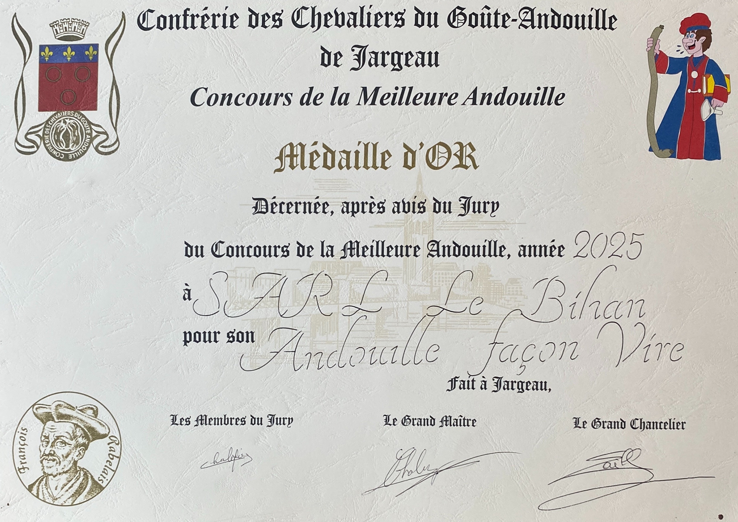 - DEPUIS 10 ANS MEDAILLES D'OR POUR NOTRE ANDOUILLE AU CONCOURS ORGANISE PAR LES CHEVALLIERS DU GOUTE ANDOUILLE DE JARGEAU